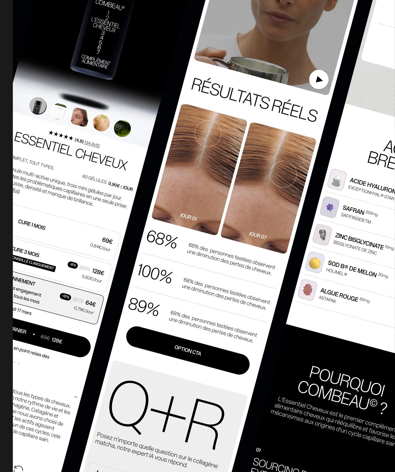 COMBEAU© réinvente les standards des compléments alimentaires. Refonte de l'univers digital de COMBEAU© : une navigation optimisée pour réduire la charge cognitive et facilier l’accès aux produits. Associée à des fiches produits enrichies, un dark mode, un espace community et un design system minimal en noir et blanc, l’expérience gagne en clarté et en efficacité.